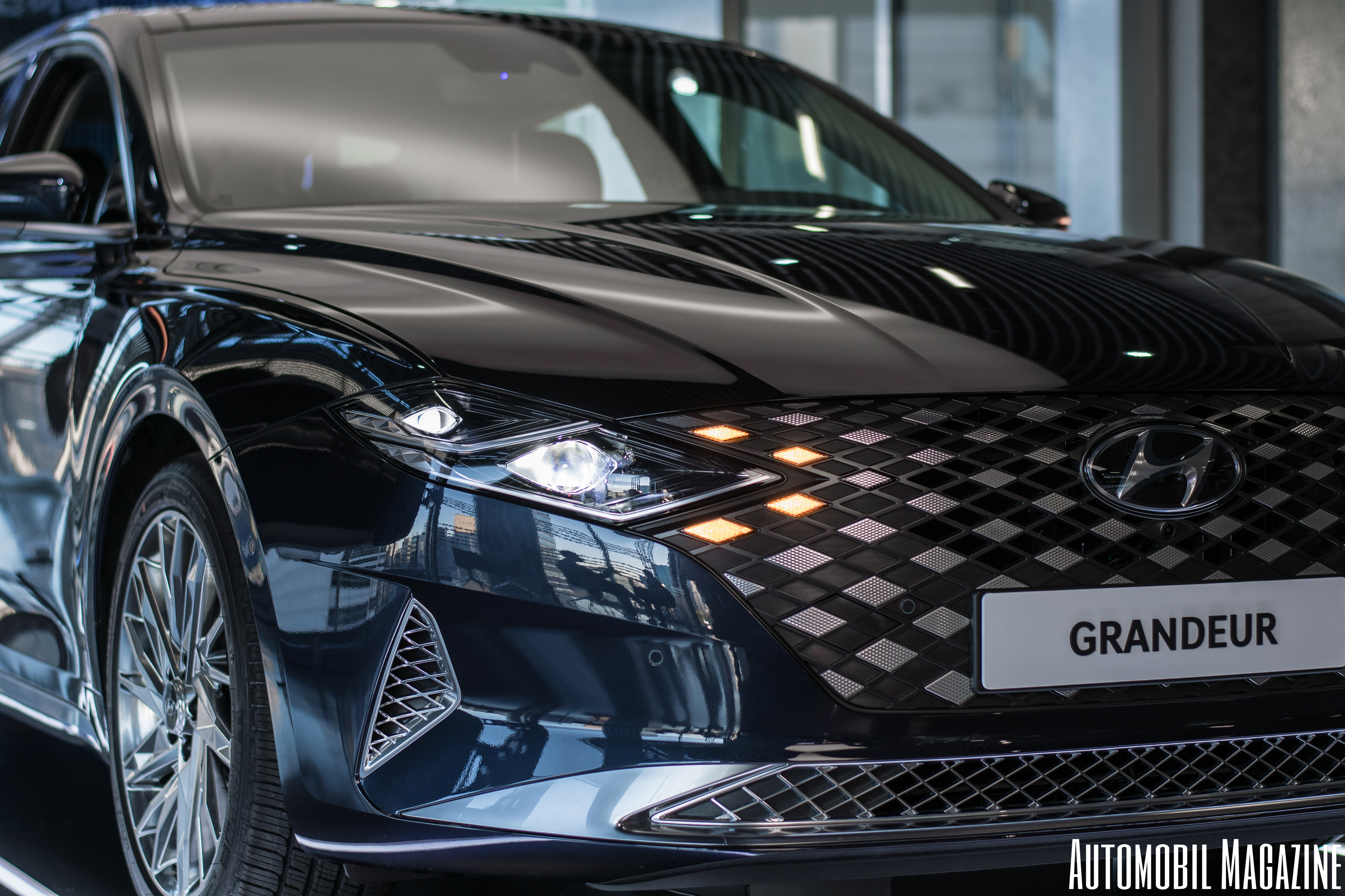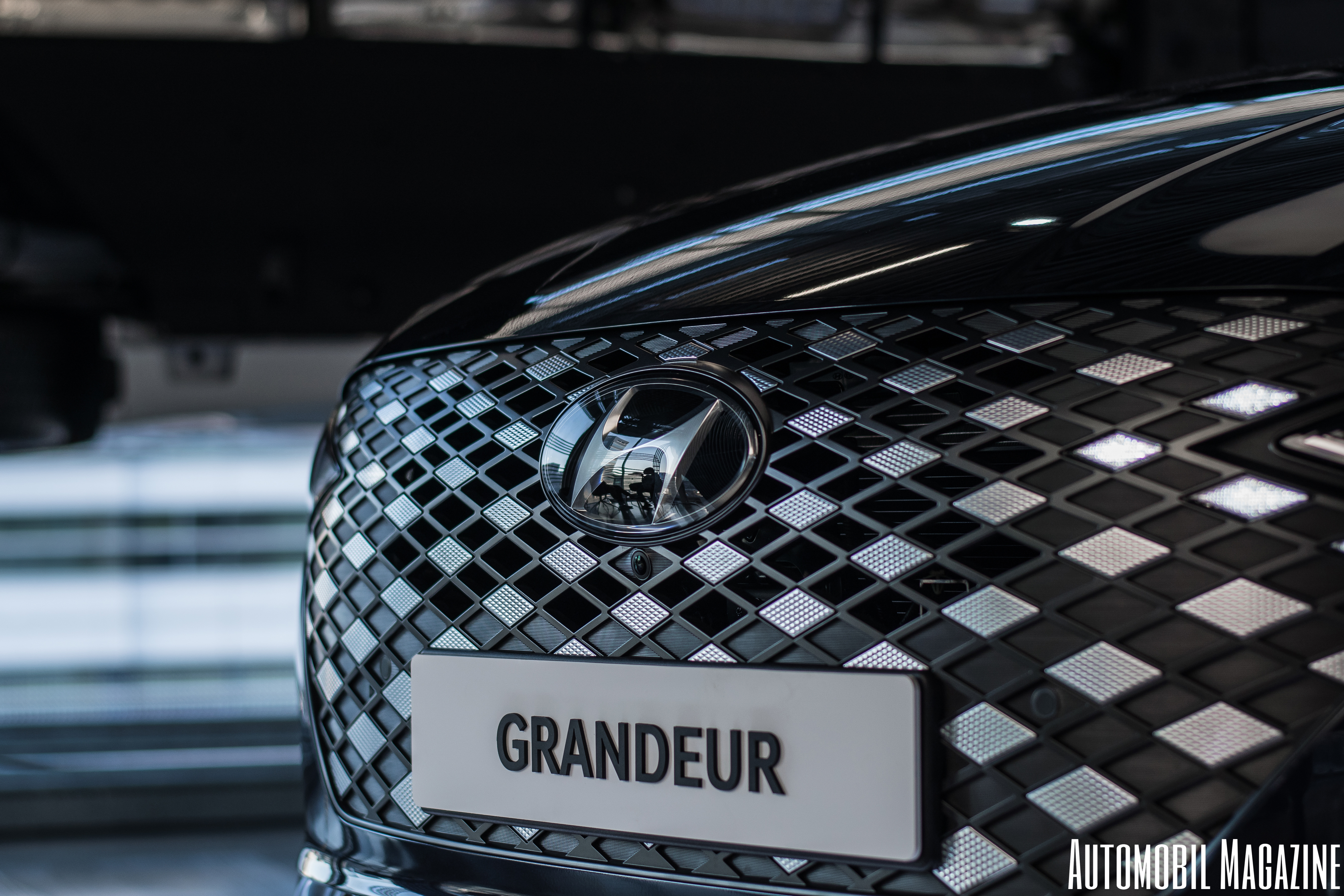 전면부는 마름모로 도배되었다. 마름모가 자동차 디자인과 어떻게 어우러질 수 있을까 싶지만 그랜저는 나름의 아이디어로 어색해 보이지 않는 방법을 찾아냈다. 그릴은 반광으로 이루어진 수많은 마름모 면으로 이루어져 있으며 일부분의 구멍에서 차량의 냉각을 돕는다. 또한 기존 캐스캐이딩 그릴의 모습이 흐트러지지 않도록 노력한 것도 엿볼 수 있었으며 아래쪽에 위치한 그릴과 양쪽 에어로 인테이크는 유광 마름모를 사용해 고급스러움을 더했다. 사실 이러한 레이아웃의 그릴은 이미 제네시스의 크레스트 그릴에서 먼저 시도되었다. 그만큼 그랜저에게 고급스러움과 중후한 이미지를 입히기 위한 하나의 방법이 아니었지 않나 추측해본다.